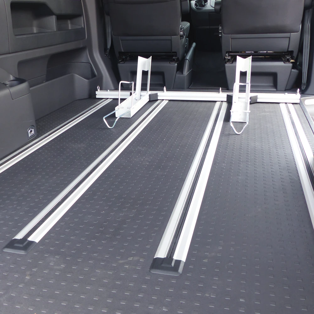 - Zur Befestigung in den originalen Sitzschienen des VW T5/T6 oder VW T7 Multivan